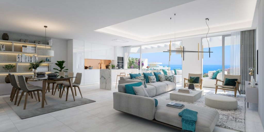 1 bed, 1 bath apartments from 420.000 euros 2 bed, 2 bath apartments from 620.000 euros 3 bed, 2 bath apartments from 900.000 euros 3 bed, 2 bath penthouses from 1.300.000 euros Prices excl. 10% VAT PHASE 1, 2 & 3 now sold out. Phase 4 last units off plan now selling. These cutting edge apartments span over a large site with plans to add in a wide array of amenities including sports and leisure, in addition to being only a short walk to the well-established town of La Cala de Mijas and the golden dunes its beach with many chiringuitos and ample space for families to relax and enjoy the Spanish tranquility. The town of La Cala de Mijas can provide all the necessities with ample doctors surgeries, dentists, banks and lawyers as well as supermarkets and a wide variety of boutique shops, restaurants and bars- Offering a variety of 1-4 bedroom apartments and penthouses, The Palms also boasts an expansive resort area with beach entry pools, a lap pool, indoor and outdoor gyms a kids play area and ample natural greenery in which families can spend their days exploring. The apartments benefit from high end fittings and fixtures, including open plan kitchens A-rated energy appliances as standard and have incredible views of both the mountains and the sea, from terraces due to their hilltop location. fMalaga Airport, Fuengirola, Torremolinos and Malaga city are in one direction with Marbella and Estepona only a short drive the other. Mijas has easy access to the very best of The Costa del Sol and beyond.