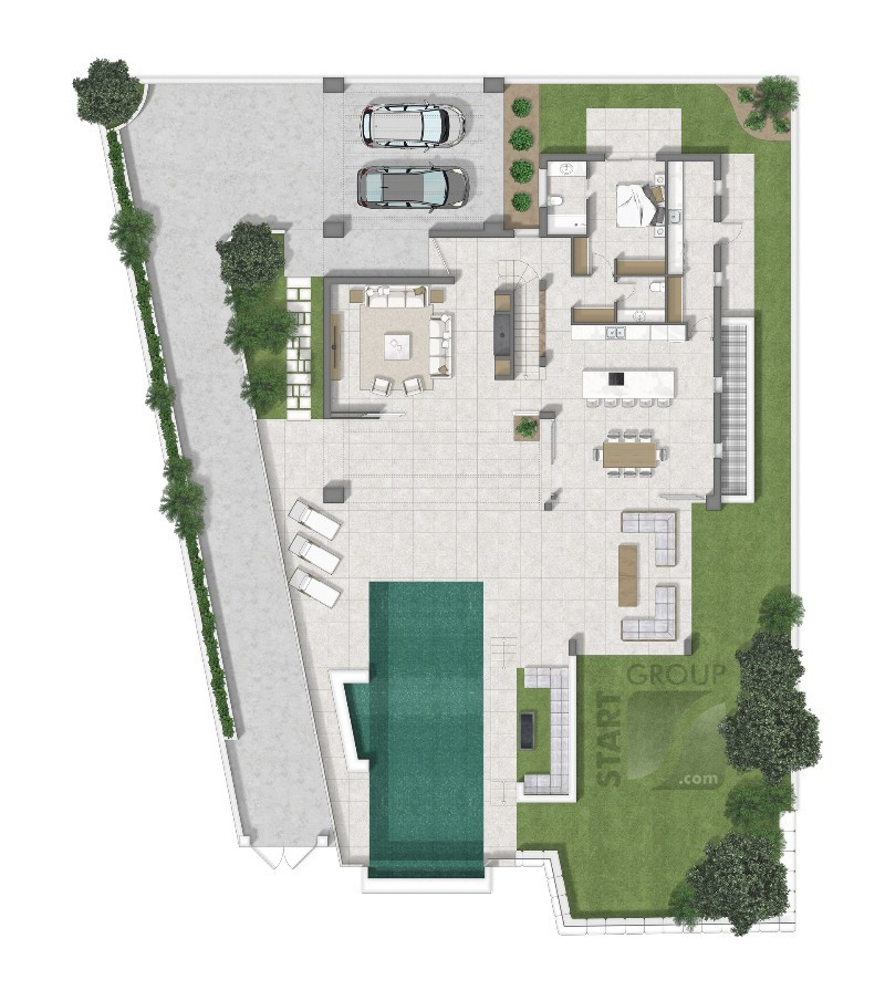 Spanish Living Group are proud to present this boutique development of 10 modern design villas, set in the privileged area of El Chaparral in Mijas Costa. El Chaparral is an exclusive urbanization of luxury villas situated in between Fuengirola and Marbella and only 20 minutes drive from Malaga airport. The excellent El Chaparral golf course is located only a few hundred meters from the villas. This 18-hole golf course is surrounded by an impressive natural pine forest. This is one of the few places in the world where you find this special variety of pine trees which forms a spectacular scenery with the golf course nestled in between and with views of the sea and the mountains. The picturesque village of La Cala de Mijas is only minutes away by car or a mere 20 minute walk along the beach. In La Cala de Mijas you can find an abundance of nice restaurants, shops, supermarkets and some great wine bars. This area has become increasingly popular in recent years thanks to the fact that the original village has maintained its Andalusian charm while new modern apartments, townhouses and villas have been built in the newer area behind the village, yet less than a kilometer from the beach. The villas all benefit from large open spaces. When entering the property, you find yourself in a grand hall with double height ceilings, leading into a bright and spacious living-room with a fireplace and vaulted ceiling. Adjacent to the living-room, you enter a separate dining area that opens to an amazing state-of-the-art kitchen featuring an impressive cooking island. The ground floor enjoys direct access to a lush Mediterranean garden with a large private swimming pool. The main outdoor terrace is partly open and partly covered with a lovely designed pergola, so you can choose between sun or shade. On the ground floor we can also find a large bedroom with en-suite bathroom as well as a separate guest bathroom and a big utility room. You reach the top floor via a beautifully designed staircase which is an iconic architectural feature in itself. The master suite accommodates a spacious bedroom with views and a private south facing terrace as well as walk-in wardrobe and, of course, a luxury en-suite bathroom. On the top level of the villa there are two more bedrooms with built-in wardrobes and a bathroom. Each property has a private gated entrance leading up to a large covered carport with space for two cars. The properties are fenced off for privacy as well as security. The exterior retaining walls are built with "Casares stones" which are huge decorative boulders that give the properties an aspect of utmost luxury - even from the outside. The buyer has the possibility to buy the villa with an optional basement. This area can include a garage for two to three cars, a guest bedroom, bathroom, storage area as well as a room that could be made into a gym, games room or even a home cinema! Villas with 4 bedrooms, 3 bathrooms, from 1420.000 euros (excl. 10% VAT)