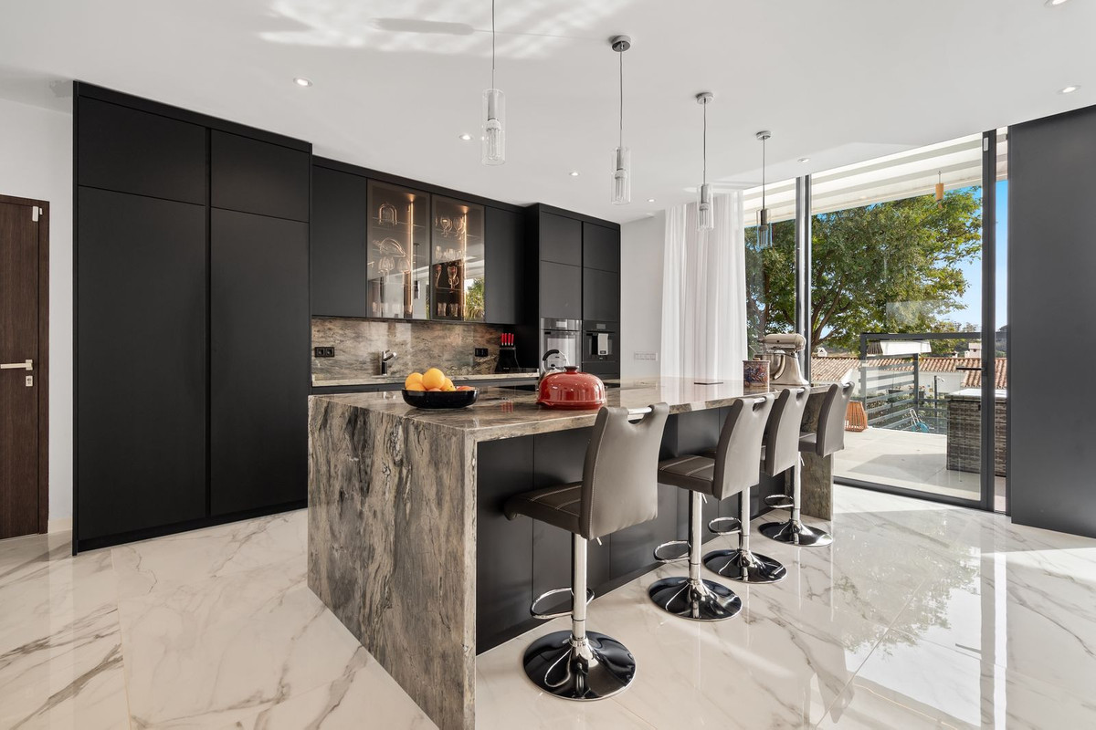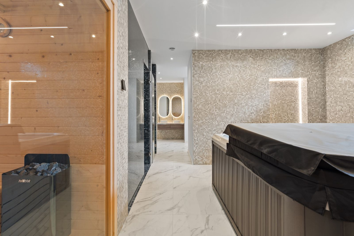 Contemporary luxury villa with sea and golf views for sale between Marbella and Estepona A refined detached villa set on a generous plot, offering sea and golf views, spacious interiors, landscaped gardens, private pool, wellness areas, and advanced energy systems. Set on a private 1,680 m² plot in the established residential area of El Paraíso, this detached villa offers generous space, privacy, and a strong connection to light and nature. The architecture is contemporary, while the interiors are warm and refined, creating a comfortable home that works equally well for everyday living and entertaining. The property has a total built area of 980 m², along with 152 m² of terraces. Its south-west orientation allows sunlight throughout the day and opens up views across the golf course, gardens, and surrounding mountains and sea. Inside, the villa features five spacious bedrooms and seven bathrooms, all finished to a high standard. The main living level is open and well connected, with a large lounge, dining area, and a fully fitted designer kitchen, equipped with premium Gaggenau and Miele appliances. This floor also includes two en-suite bedrooms, both with direct access to the outdoor areas. Large floor-to-ceiling windows bring in natural light and create a seamless flow between indoor and outdoor spaces. All levels are connected by a private lift. On the first floor, there are two en-suite master bedrooms enjoying open sea and golf views. The lower level is designed for both comfort and leisure, offering a private gym and spa area with sauna, jacuzzi, and hammam, along with entertainment spaces, staff accommodation, storage, and utility rooms. The villa is equipped with underfloor heating, advanced climate control, double glazing, and a fireplace. Energy efficiency is enhanced through photovoltaic solar panels with FVE battery system and solar water heating. Outside, the mature landscaped gardens provide a high level of privacy. The property also offers generous terraces, a barbecue area, and a private swimming pool. A private garage completes the home. Conveniently located close to golf courses, shops, the beach, and schools, this villa is a well-rounded and attractive property in one of the Costa del Sol’s most sought-after residential areas.
